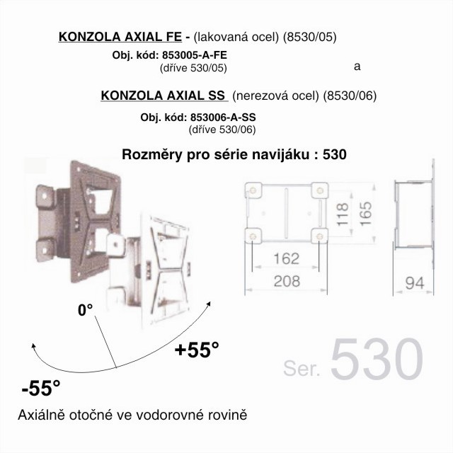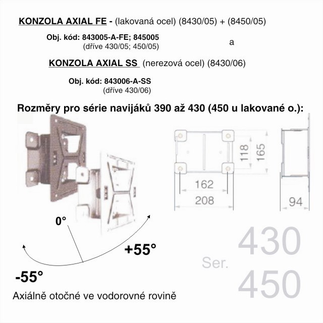 KONZOLA AXIAL FE z lakované oceli je závěsné zařízení pro navijáky, které je potřeba natáčet ke směru tažení hadice.Nákres a způsob montáže, rozměry včetně šablon k vrtání, jsou součástí balení.Nastavitelný nástěnný držák pro navijáky hadic série 290 – 330 – 390 – 430 – 450 – 530 – 540.