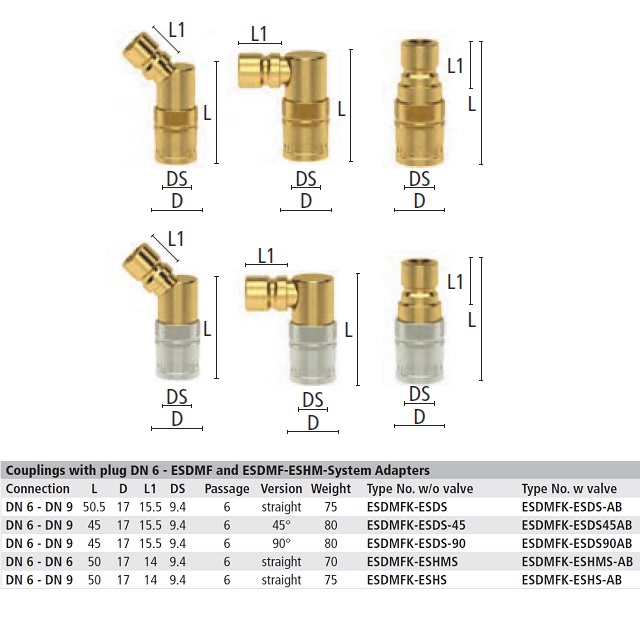 Systém ESDM je plně kompatibilní s americkým systémem DME 1/4″, nikoliv Hasco. Rychlospojky s plochým těsněním a s dvouručním provozem ESDMF s velikostí čepu trnu 9,4 mm. Systém ESDM je plně kompatibilní s americkým systémem DME 1/4″, nikoliv Hasco.Pro plastikářské stroje a formy s vedením horké a studené vody, temperovacích olejů.Rychlospojky ESDMF Plastik Dn6 s přímým trnem s/bez ventilu pro standardní hadice.Zajištění AML – použít jinou ESDMT 34001 (Rychlospojka Temp Secure).Spojky s konektorem DN 6 – adaptéry systému ESDMF a ESDMF-ESHM.