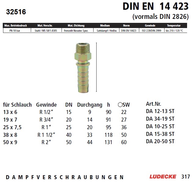 Pro použití na sytou páru do 210°C, eventuelně horkou vodu +120°C do pracovního tlaku 18 bar.Klemové spony KSM Lüdecke, viz v tabulka (uvedeno jako parametr Velikost (modul))