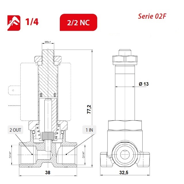 Přímo řízený ventil s funkcí 2/2 NC (2 úlohy, 2 cesty, v základním stavu zavřený ventil). Základní, mechanická část „Solenoidu prům. 13 mm“ je určena pro stejný průměru otvoru cívky 13 mm. Průtok média omezen otvorem za závity „2 IN“ [mm]. Ovládáním elektrického solenoidu se průtok zvětšuje do jeho maxima, které je v tabulce uvedeno ((v barevném (jiném) odlišení). Hodnoty delta průtoku a delta tlaku lze vyhledat v originálním katalogovém listu výrobce. Řídká média: Maximální viskozita média je uváděna 53 cSt.