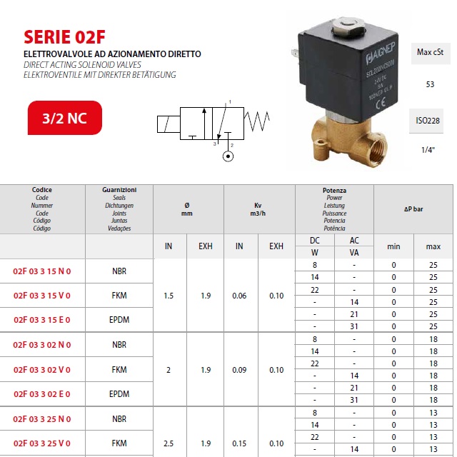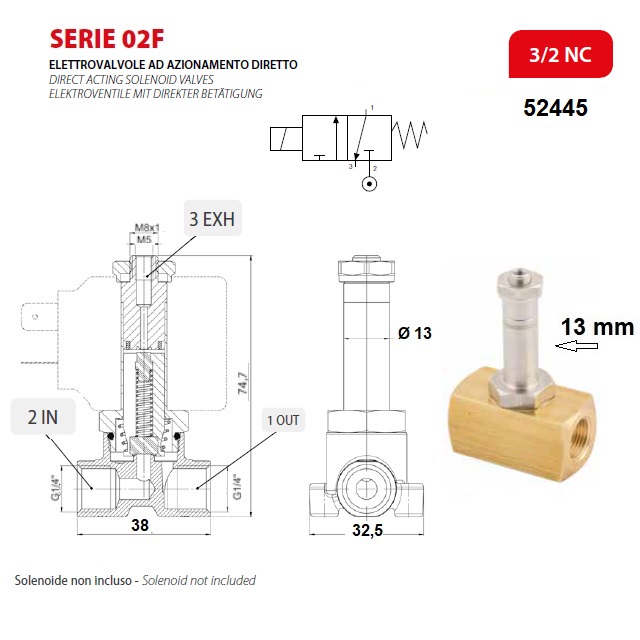 Přímo řízený ventil s funkcí 3/2 NC (3 úlohy, 2 cesty, v základním stavu zavřený ventil). Základní, mechanická část „Solenoidu prům. 13 mm“ je určena pro cívku stejnéjo průměru otvoru „13 mm“. V základním stavu „NC“ je protok média omezen otvorem za závity „2 IN“ [mm]. Ovládáním elektrického solenoidu se průtok zvětšuje do jeho maxima, které je v tabulce uvedeno ((v barevném (jiném) odlišení). Hodnoty delta průtoku a delta tlaku lze vyhledat v originálním katalogovém listu výrobce. Výběr cívek: Podstatným údajem při výběru solenoidu je průtok, vrtání a síla cívky, která ho ovládá. *D: Ovládáním 3 EXH se řídí otevření do max. výtupu (1 OUT), kde je pro všechny typy stejné vtrání 1,9 mm, viz originální katalog. Řídká média: Maximální viskozita média je uváděna 53°.