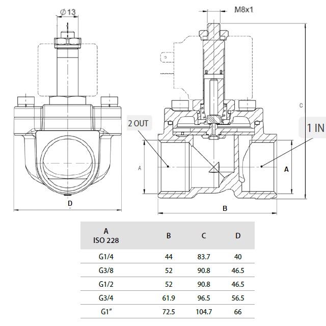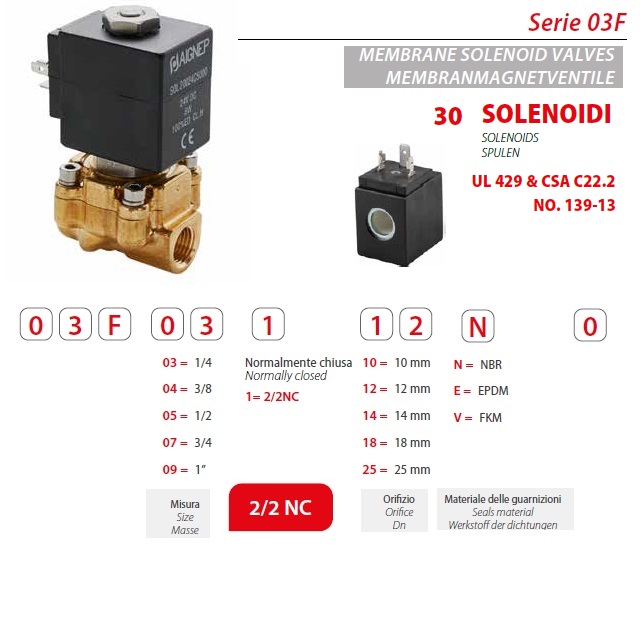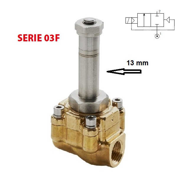Přímo řízený ventil s funkcí 2/2 NC (2 úlohy, 2 cesty, v základním stavu zavřený ventil). Základní, mechanická část „Solenoidu s průměrem 13 mm je určena pro adekvátní průměr otvoru cívky (série 3F). Výhodou membránových ventilů jsou velké průtoky. Průtok média, jejich hodnoty delta tlaku k průtoku lze vyhledat v originálním katalogovém listu výrobce [Kv kde je m3/h]. Řídká média: Maximální viskozita média je uváděna 25 cSt. Použití dle typu membrán NBR: Vzduch, inertní plyny, voda max. 75°C, minerální oleje, topné oleje. Viton: Minerální i syntetické oleje, benzíny, topné oleje. EPDM: Horká voda, pára (provozní tlak max. 2,5 bar).